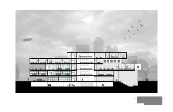 All studios are stacked facing Lake Eola and open to each other vertically for the promotion of interaction between the student echelons and the engagement of light from the atrium side as shown here in the longitudinal section.